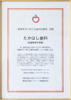 | 院長の高橋は,日本におけるインプラントに関する学会で厚労省が唯一認めている日本口腔インプラント学会の専門医です。この専門医は,愛媛県では4人(南予は自分1人,中予は0人,東予は3人)の内の1人になります。今後も更新しいくことにより学会のチェックを受けて,より安全な治療に取り組んでいきたいと思っています。 | 歯が悪くなる前に,削らずに治せたら一番良いことです。昔は歯医者といえば歯は削るものでした。当院は削る前に予防する歯科医院を目指しています。それゆえスタッフ全員で「歯を守ること」を継続して勉強しています。その専門学会である日本ヘルスケア歯科学会において審査を受けて,認定に合格しています。 |